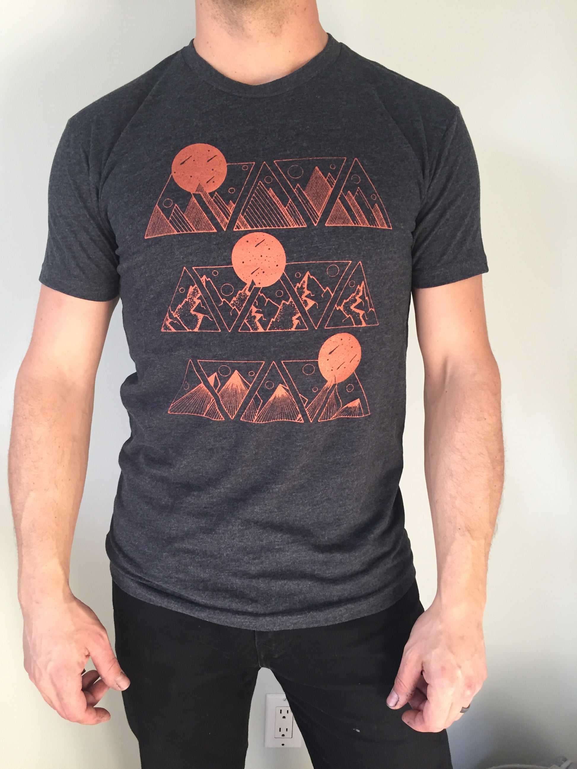 Copper metallic ink makes this classic fit t-shirt stand out. Screen printed by hand with eco-friendly ink and heat set to resist fading. The tee is a 60/40 cotton/polyester mix, which gives it a super soft, broken-in feel.