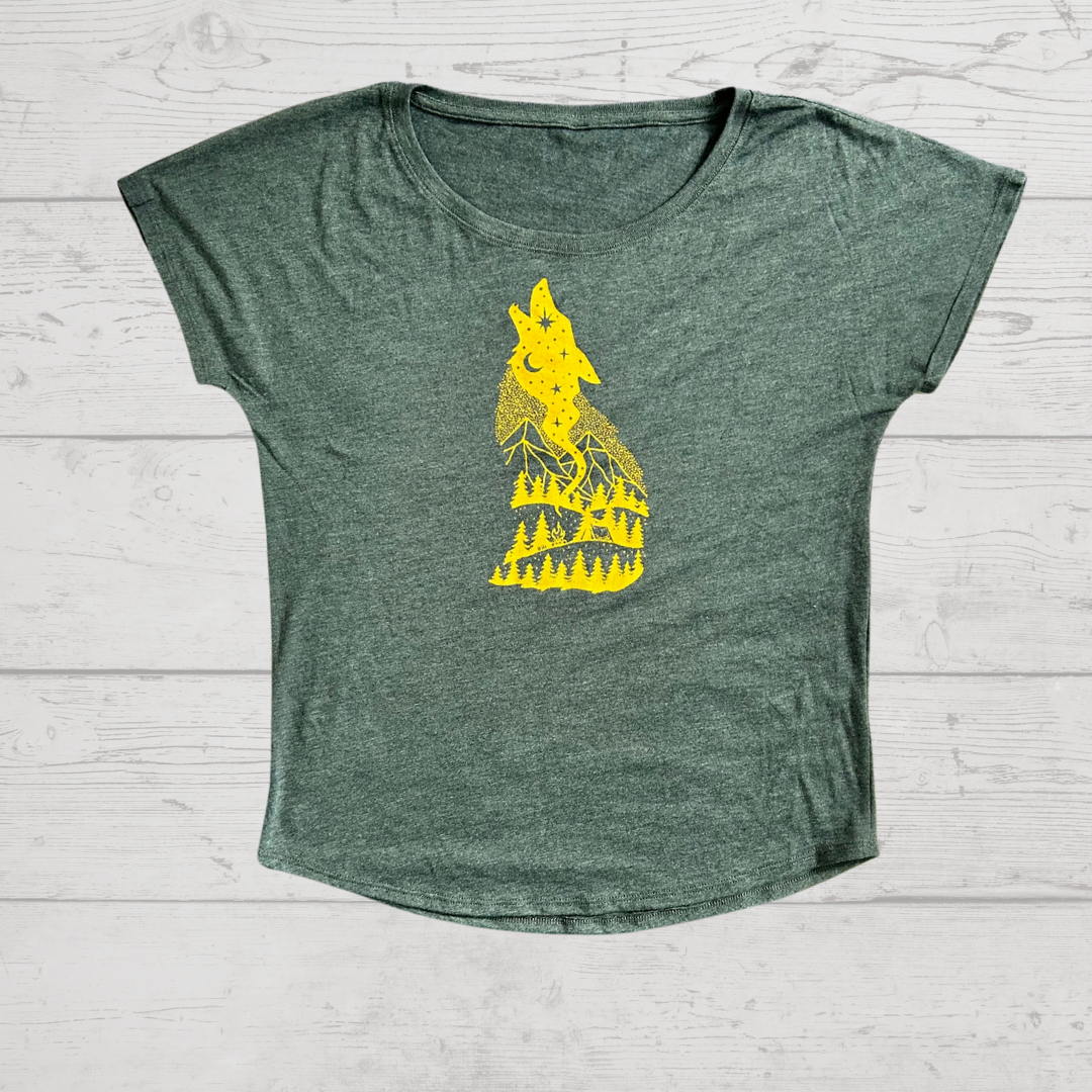 Experience the ultimate in comfort with the Howling Wolf Dolman Tee! Featuring dolman sleeves, a relaxed scoop neck, and a hand-printed design by the talented Octopus Studio team, this lightweight tee exudes a sense of style and connection with nature.