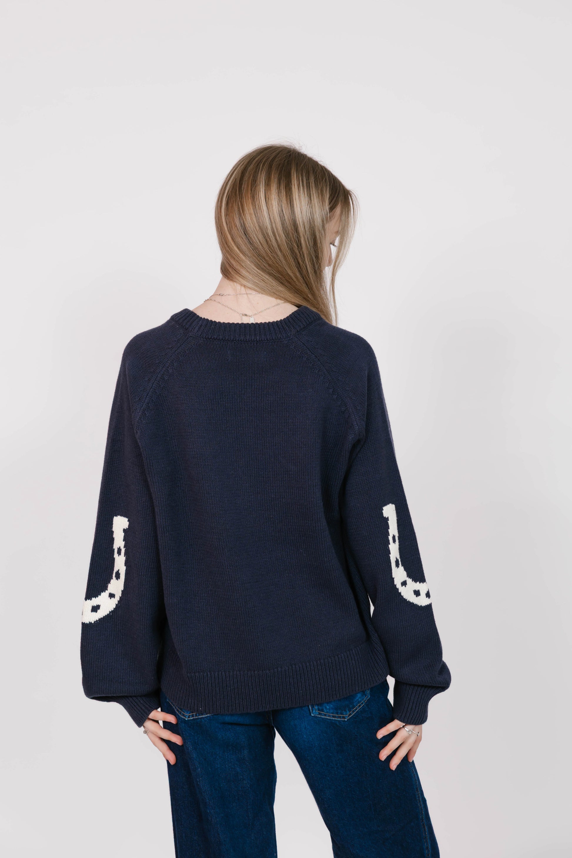 - Round neckline sweater made from soft 60% Cotton/ 40%Acrylic yarn with the horseshoe intarsia design on sleeves